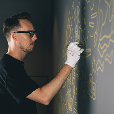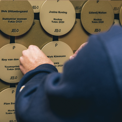De entourage kent subtiele verwijzingen naar topsport en de Olympische Spelen in het bijzonder. Die zie je terug in de verlichting en in een unieke wanddecoratie bestaande uit medailles van diverse goudkleuren. Hier hangen, symbolisch, alle goudenmedaillewinnaars van de Olympische Spelen in Tokyo. Maar het meest bijzondere is toch wel het Artwork van Pablo Lücker, speciaal gecreëerd voor, en gemaakt ín de JEE-O Golden Suite.