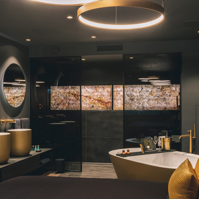 Wat deze Golden Suite zo bijzonder maakt is de link van design naar sport. Het is een totaalbeleving van luxe, rust en inspiratie. Goud staat voor het hoogst haalbare, the best of the best. De beleving in de JEE-O Golden Suite sluit daar naadloos op aan. Aan álles is gedacht en het gevoel van luxe is tot in de kleinste details doorgevoerd; van prachtig bedlinnen en zachte kussens tot een knisperend haardvuur en goed gevulde minibar. De suite is natuurlijk voorzien van de luxe JEE-O designelementen zoals het vrijstaande bad, de luxe douches, waskommen en kranen. Van hoogwaardige kwaliteit en duurzame materialen, uitgevoerd in een matgouden finish.